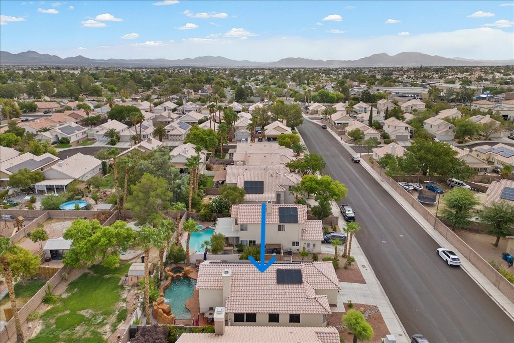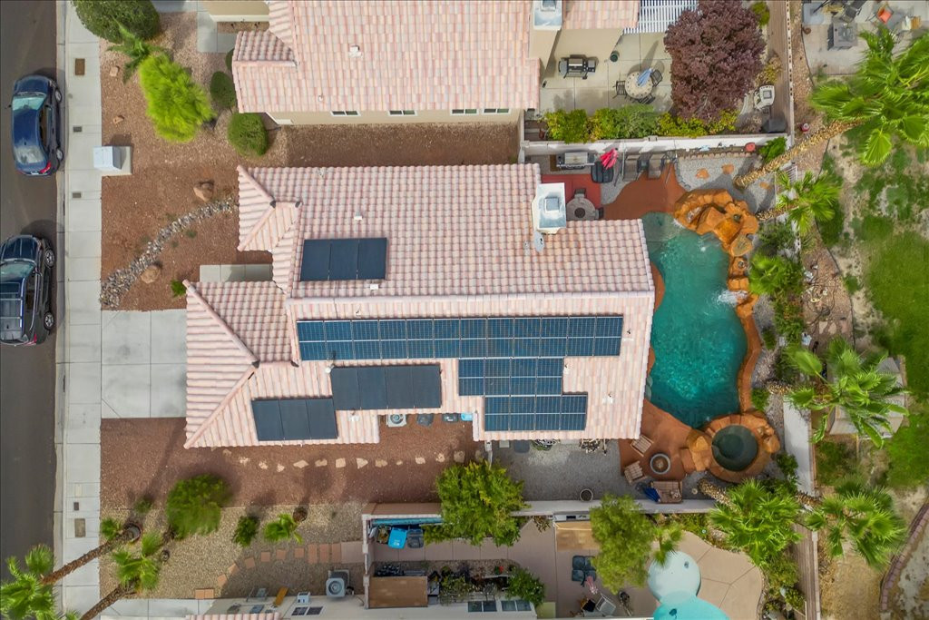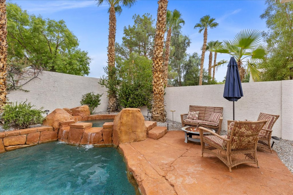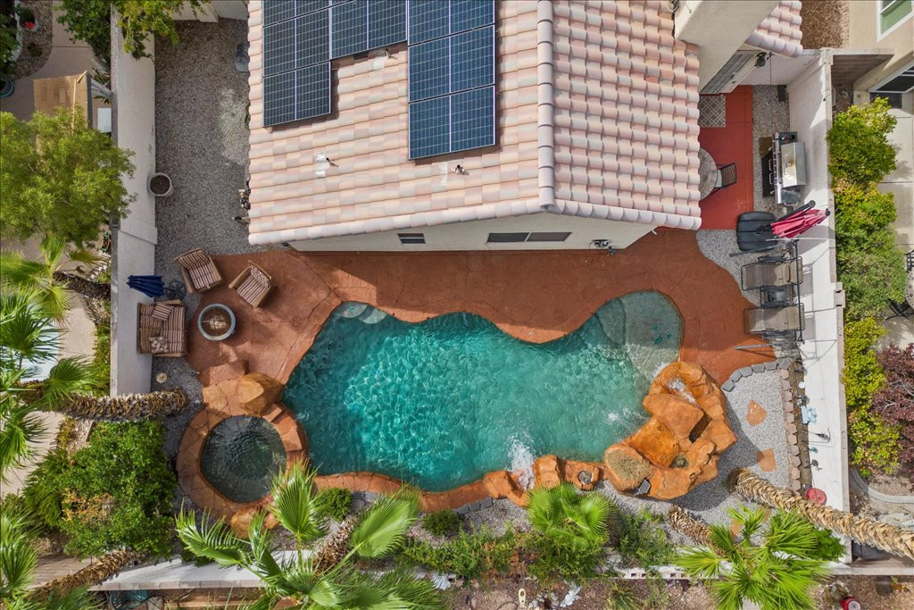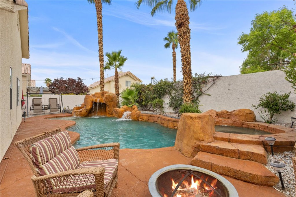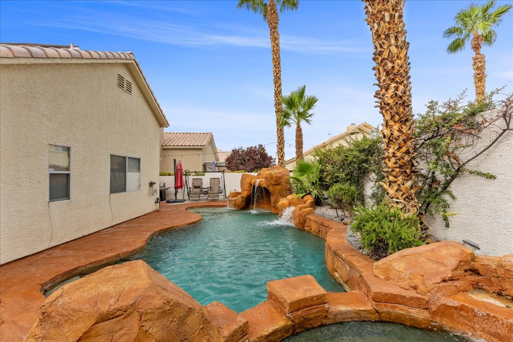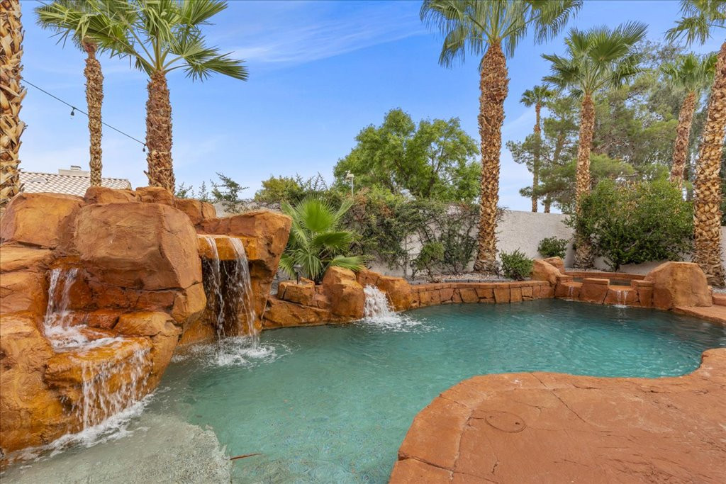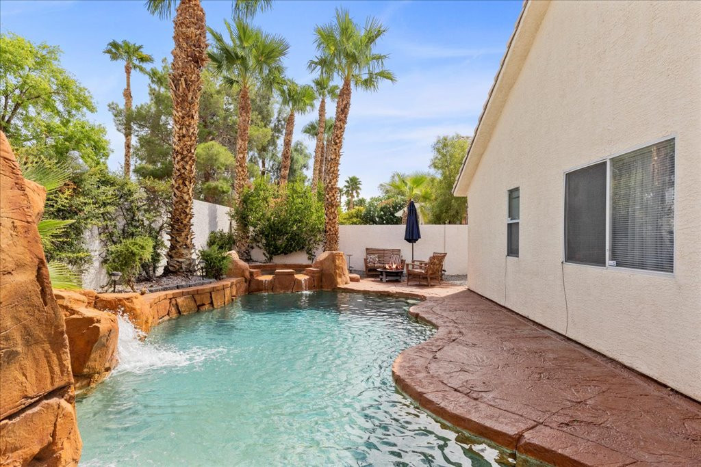 Welcome to this charming single-story home in the quiet Rancho Alta Mira community of Las Vegas. With 1,244 sq. ft., this 3-bedroom, 2-bath property offers an open and inviting layout with vaulted ceilings, ceiling fans, and a cozy gas fireplace. The kitchen features granite counters and a sunny breakfast nook with bay window. Step outside to a private tropical-style backyard designed for entertaining, complete with Pebble Tec pool, spa, rock waterfalls, grotto, and stained concrete patio surrounded by lush landscaping. This home also includes leased solar panels, providing energy efficiency and cost savings. Conveniently located near the 215, shopping, dining, and schools, it offers comfort and convenience. Low HOA. Don’t miss the opportunity to own a well-kept property in one of Las Vegas’ established neighborhoods. Links to watch!